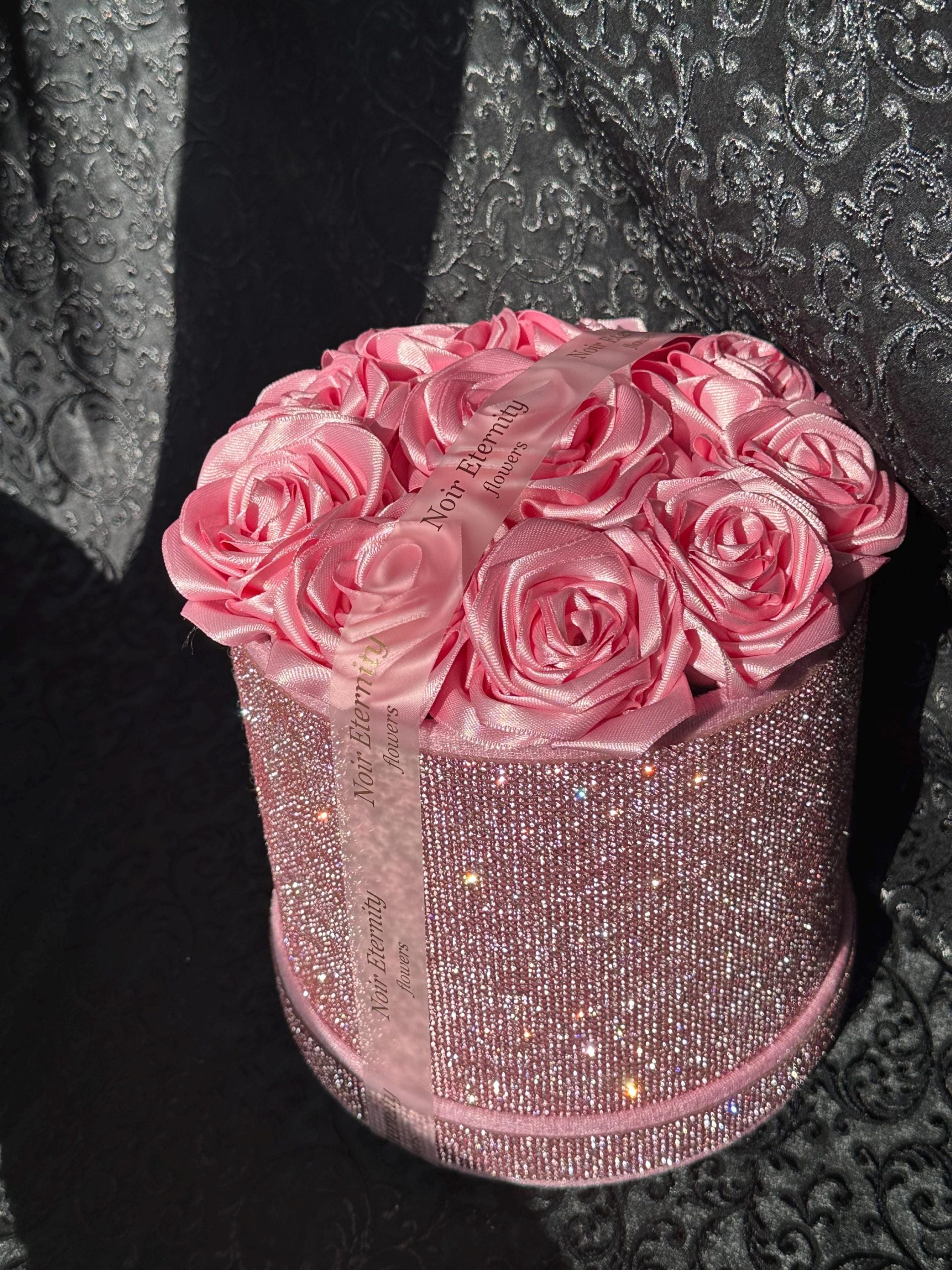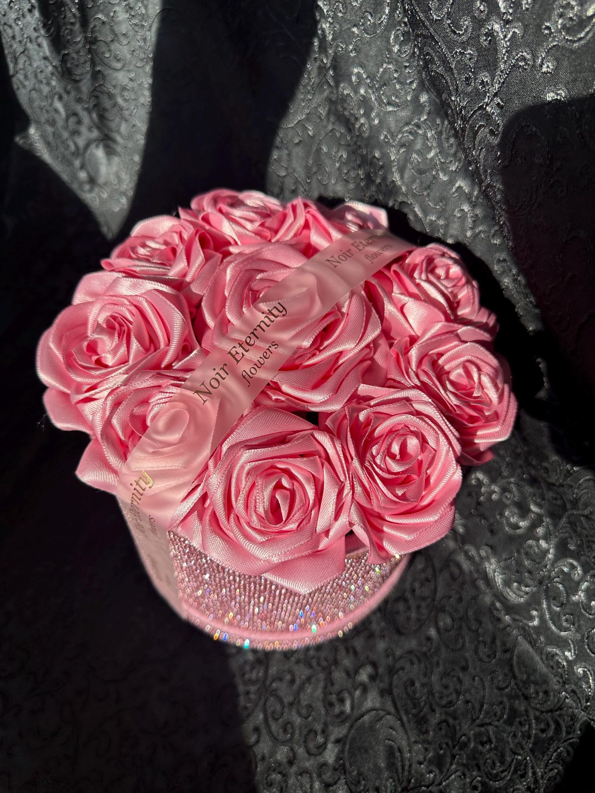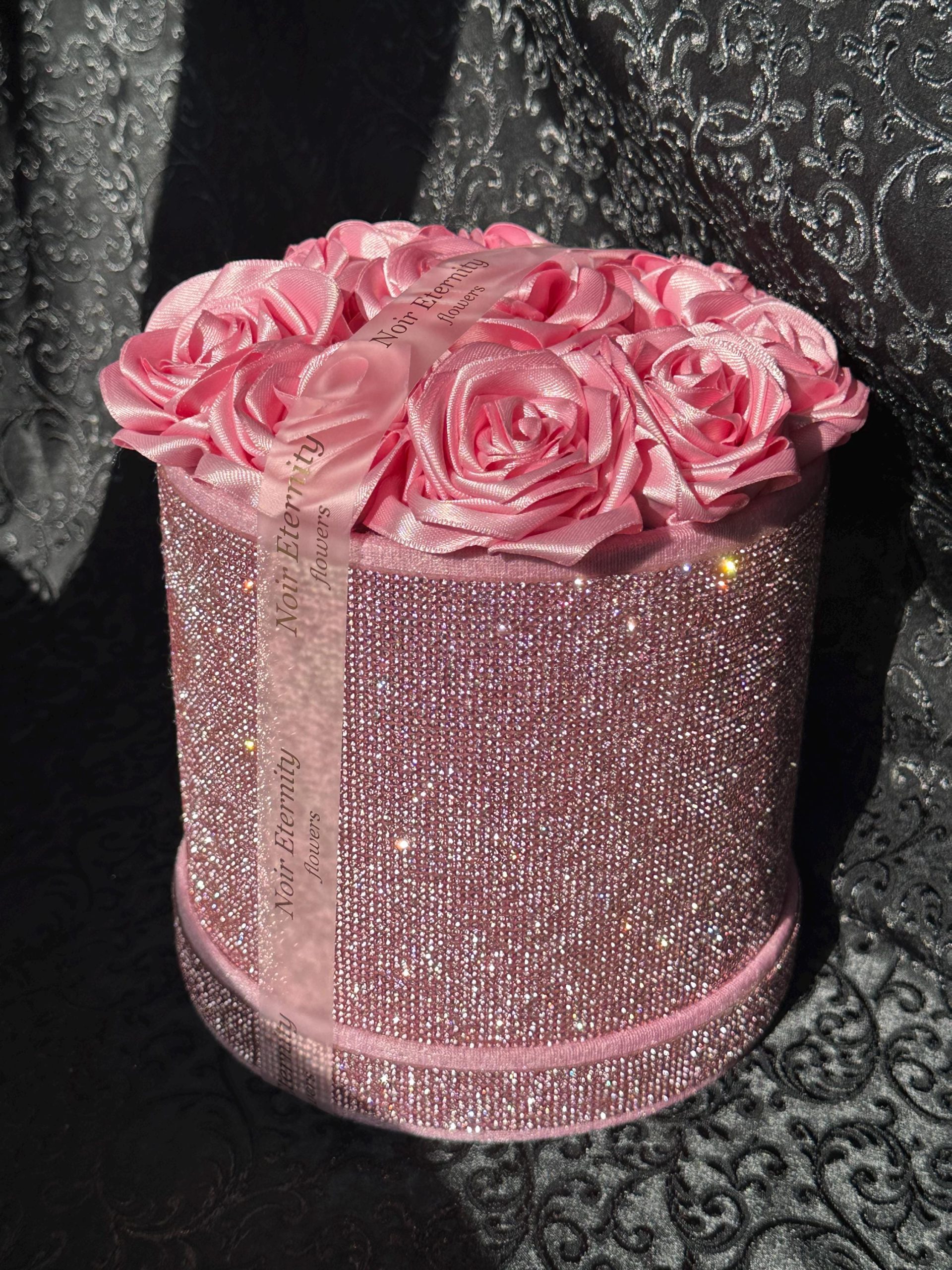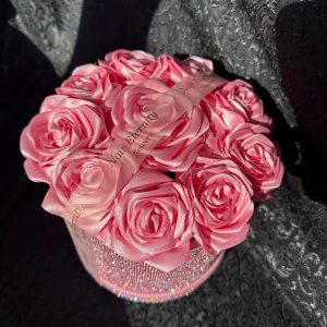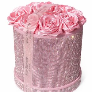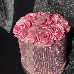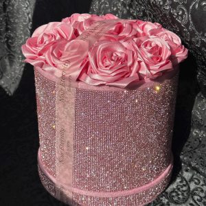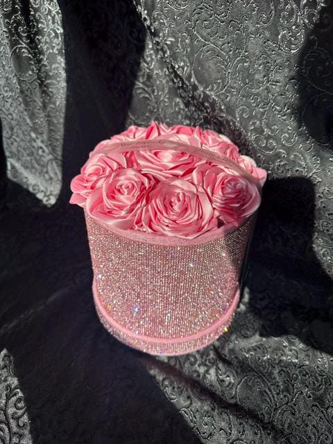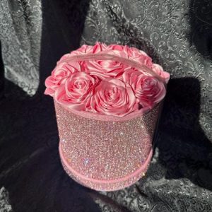 Luxurious pink satin rose box featuring 10 handmade roses arranged inside a sparkling rhinestone cylinder.